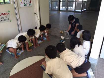 今日は復習を兼ねて、送風機を使って自分たちが作った車が