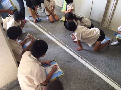 帆が風を受けて車が進むと歓声が上がり、メジャーで車の進んだ距離を測って記録しました。