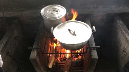ラストスパート。カレー粉を刻み、野菜が煮えるのを待っています。