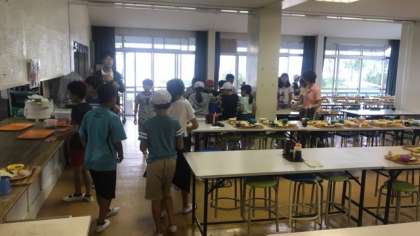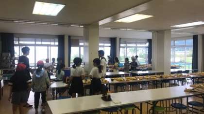 食堂での初めての食事。係の子どもたちが、ご飯やみそ汁、お茶を配るなど準備を整えています。