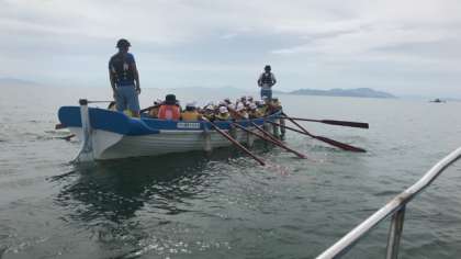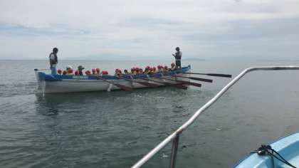 二人で8キロある櫂を操作します。最初はなかなか二人の息が揃わず苦戦しています。それが12本もあるのですから・・