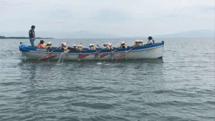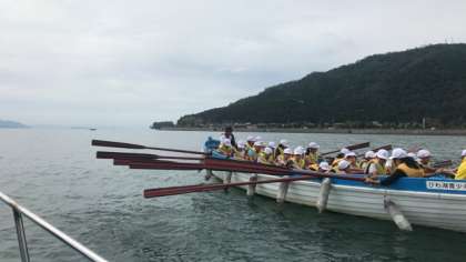 2号艇です。だいぶ息が合ってきました。先行する1号艇に追いつけと気持ちを一つに頑張っています。不思議ですね。呼吸が合うとどんどん進んでいきます。