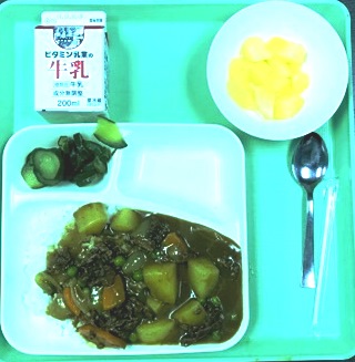 今月は、食物アレルギー対応サポート月間です。今日のカレーライスのルーには小麦粉ではなく、米粉が使われています。カレーの香辛料のせいか、米粉独特の香りも感じられず、小麦粉とほとんどかわらない味になっていました。小麦アレルギーの子どもたちもみんなと同じように食べることが可能なカレーライスです。
