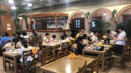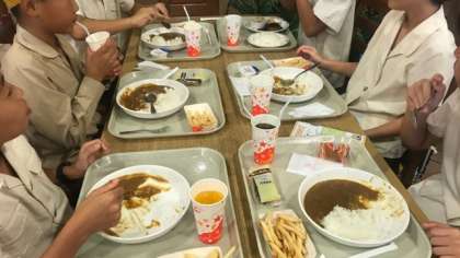 ランチタイムです。グループごとにレストランを選んで、スクールメニューの中から選んで食べています。