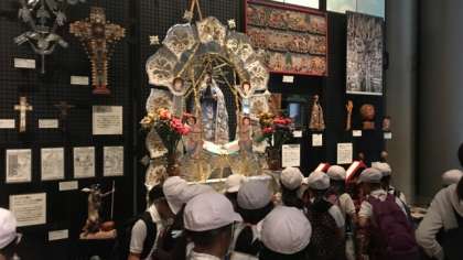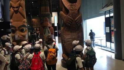 アステカの暦石、トーテムポールなどの展示を興味深く見学しています。