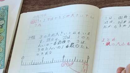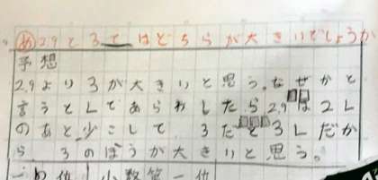 今日のめあては「3.0と2.9はどちらが大きいか」です。多くの子どもたちが「3.0」と予想をしているのですが、先生はその理由もノートに書くように指示しました。