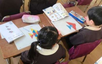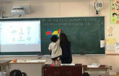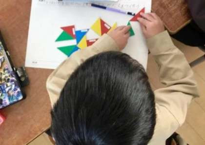 子どもたちは、三角形の色板を使って、まずは、魚やロケットなど教科書に記されているものと同じ形を作っていきました。その後は、自分の好きな形を作っていきました。「マグロ」「凧」「クリスマスツリー」など、思い思いにつくる中で、