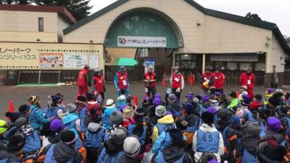 六甲山スノーパークに着きました。心配された雨も今のところはなく、インストラクターから説明を受けています。