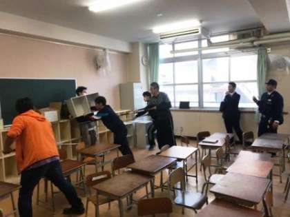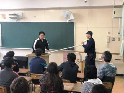 その後は、福島警察の方に講師として来ていただき、不審者が侵入してきたときの対応について、シミュレーションもまじえて、研修を深めました。
