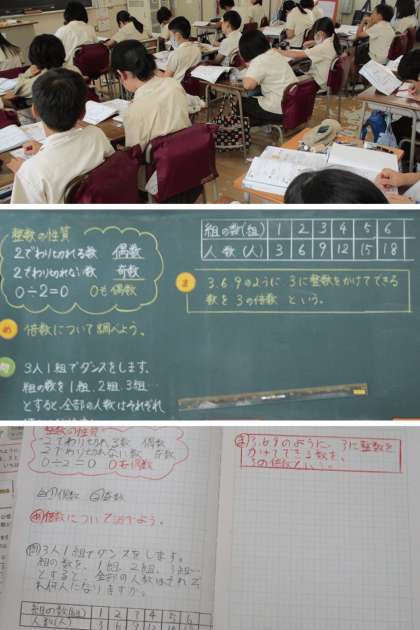 算数科の時間は、3人グループをつくるときの、グループの数と全体の人数を調べ、3の「倍数」の意味について学習しました。