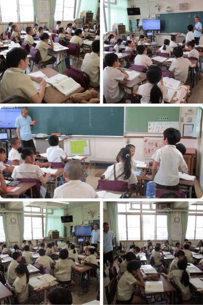 国語科の時間は、「夕日がせなかをおしてくる」の詩で、「連」がどのように分かれるのか、グループで話し合って意見を出し合いました。
