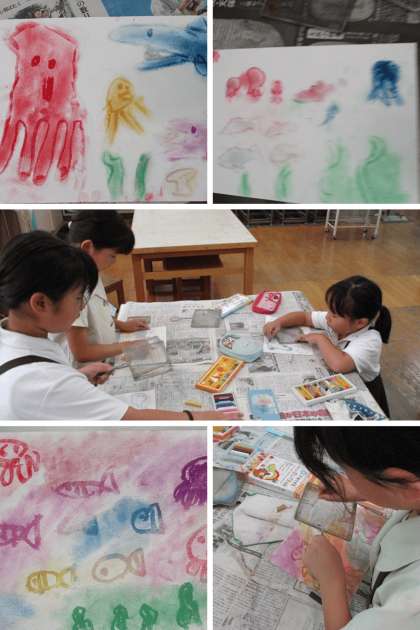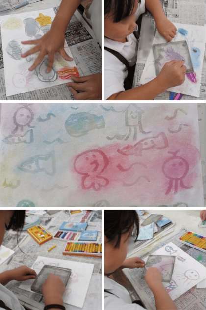 画用紙に白色のパスの使って絵を描き、パスで描いた上からぼかし網でコンテを削り、粉をふりかけます。