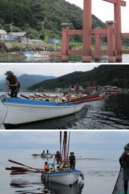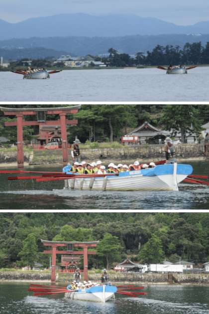 湖の上に建てられた鳥居をカッターボートでくぐりました。