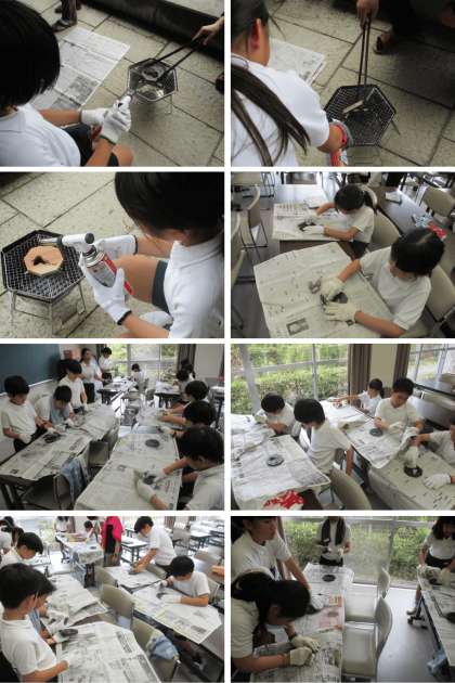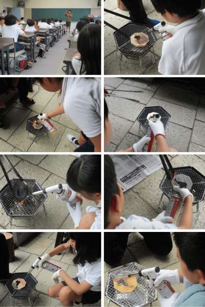間伐材を使った材料の板をバーナーで焼き、新聞紙でみがくと、きれいな色目になります。