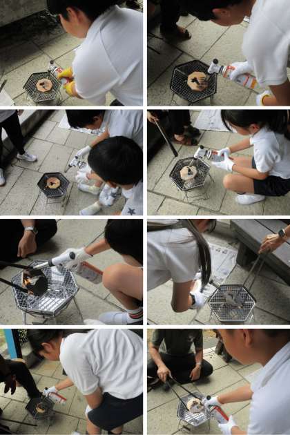 雨のため、湖でのいかだ作りの活動から、「焼き板作り」に変更しました。