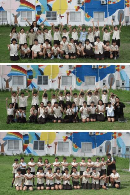 宿舎のペイントをバックに、学級ごとに集合写真を撮りました。