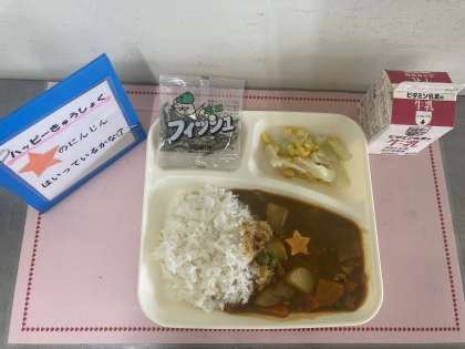 今日のチキンカレーライスには星形のラッキーにんじんが入っていました。