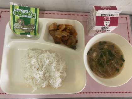 9/11(木)の給食は、コッペパン、ブルーベリージャム、牛乳、鶏肉のバジル焼き、ベーコンと野菜のスープ煮、キャベツときゅうりのサラダです。