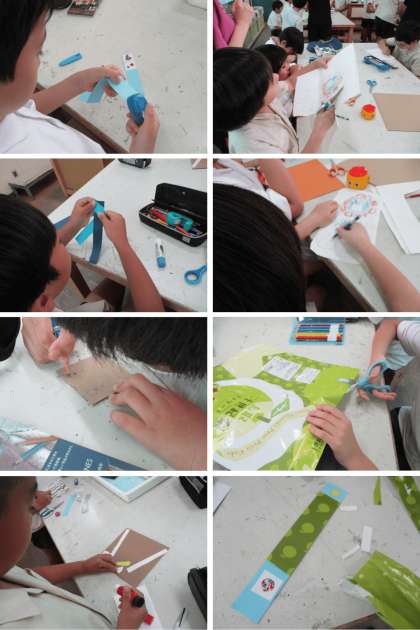 画用紙の台紙に、空き箱や包装紙などの図柄やデザインを貼っていき、お気に入りの「しおり」を作っていきます。