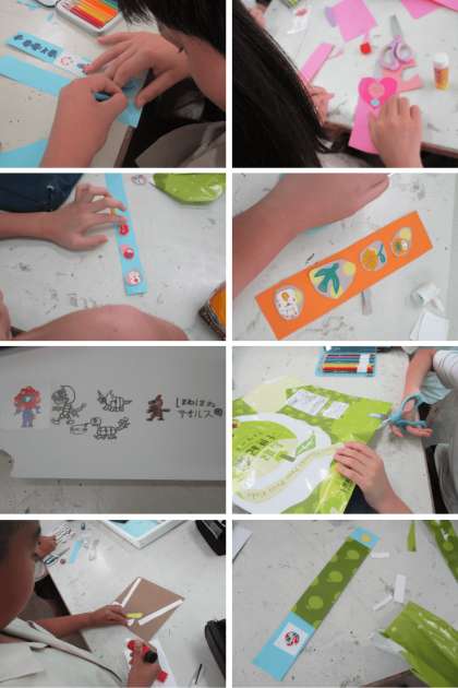 作業の途中で友達の作品を見たり、工夫したところを紹介し合ったりしながら、イメージをふくらませていきました。