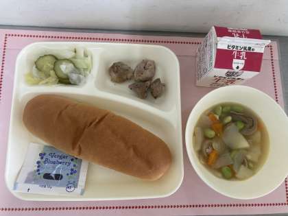 9/12(金)の給食は、ハヤシライス、グリーンアスパラガスとコーンのサラダ、洋なし(缶)です。