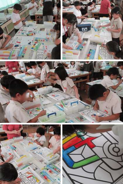 図工科の時間は、絵の具の色を少しずつまぜて、似ているけれど少しずつちがう色をたくさん作り、ぬり分けました。