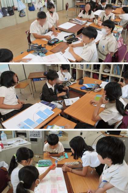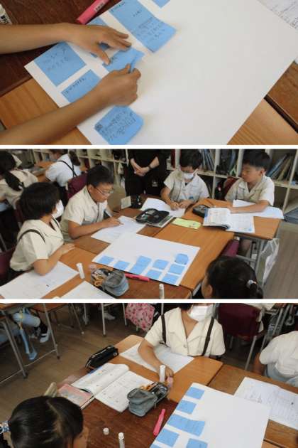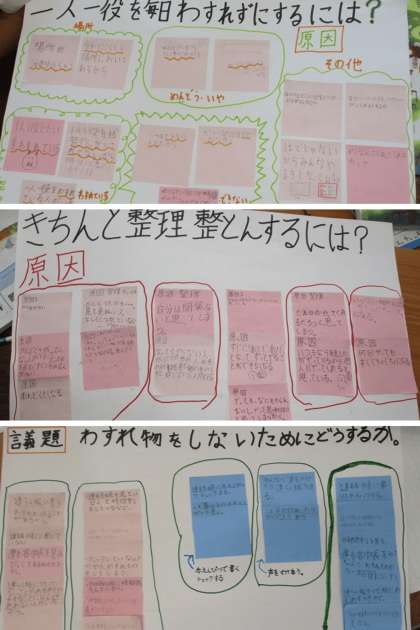 今日は、「当番活動を毎日忘れずにするには」「きちんと整理整頓するには」「忘れ物をしないためにどうするか」など学級にあるいくつかの問題について、付せんをつかってグループで話し合いました。