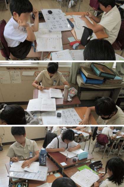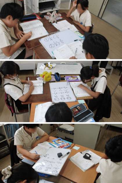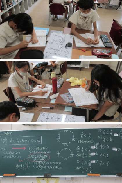 算数科の時間は、3/5と2/3の大きさを比べる方法を考えました。
