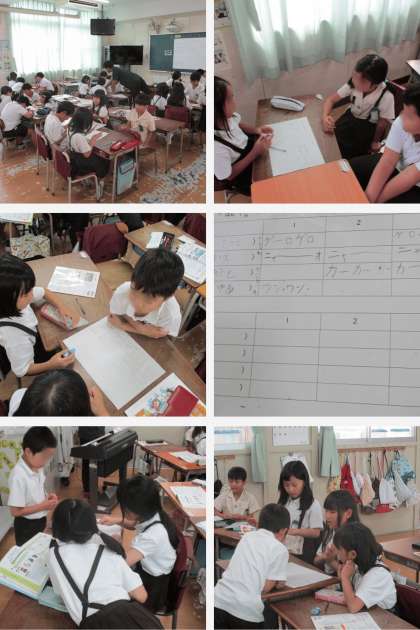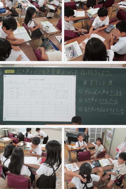 音楽科の時間は、グループで「なき声」を重ねて音楽をつくっています。