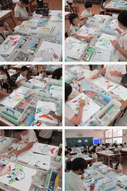 図工科の時間は、絵の具の「にじみ」や「ぼかし」などの技法を使って、魚の絵に着色しました。