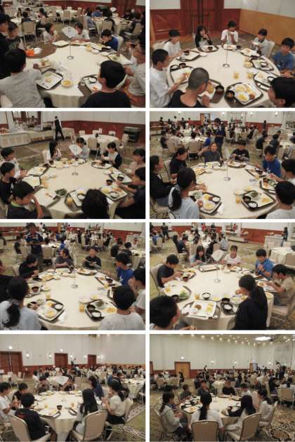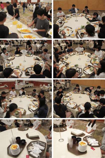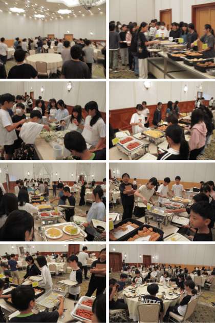 ごはん、パン、おみそ汁、オムレツ、ソーセージ、納豆、サラダ、果物など、たくさんの品から自分で考えてお皿によそいます。