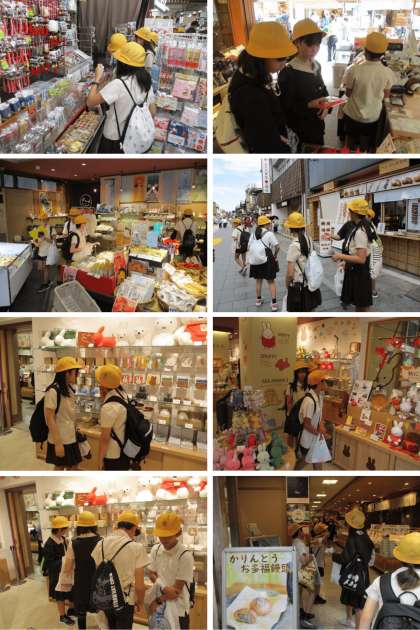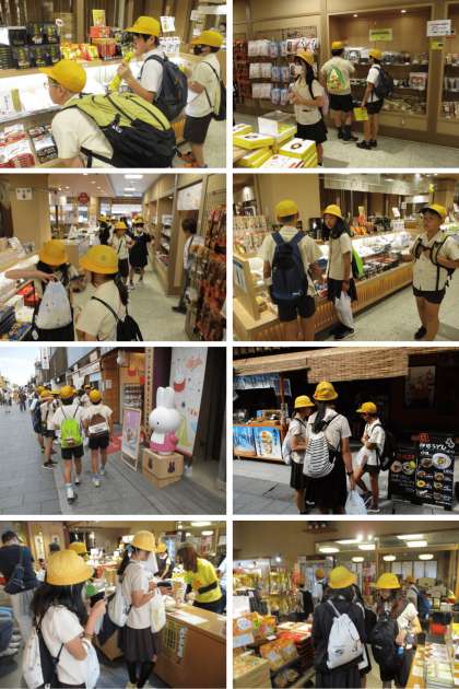 おかげ横丁で、グループごとに買い物を楽しんでいます。