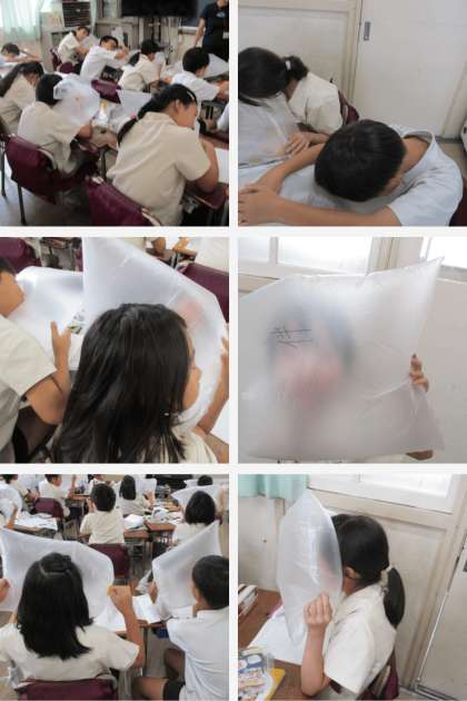 理科の時間は、ビニル袋の中にとじこめた空気をさわったりふれたりしてみました。
