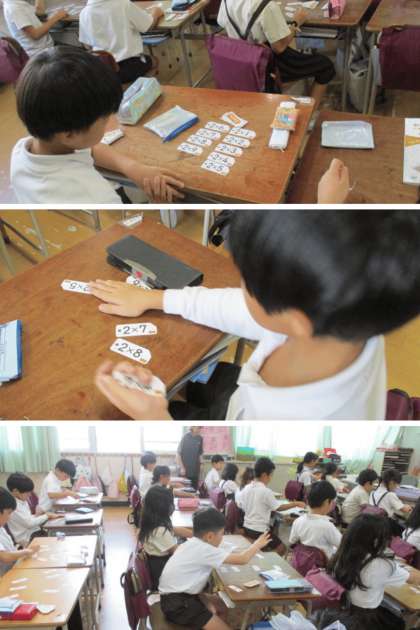 授業の最後に、九九カードを使って、2の段の九九の復習をしました。