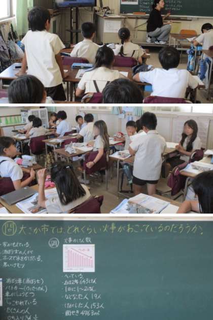 社会科の時間は、大阪市で火事がどれぐらい起きているのか、グラフを見て気付いたことを出し合いながら調べました。