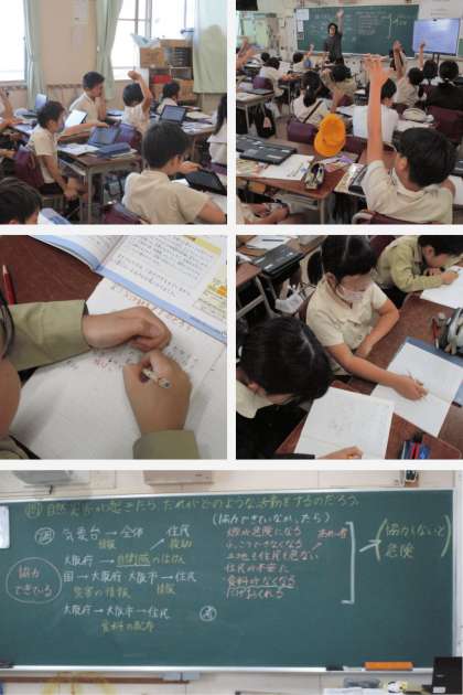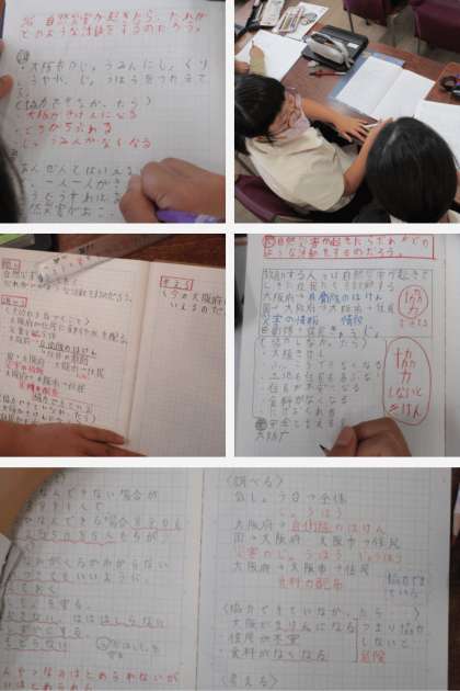 社会科の時間は、自然災害が起きたら、だれがどのような活動をするのか、教科書などの資料をもとに調べました。