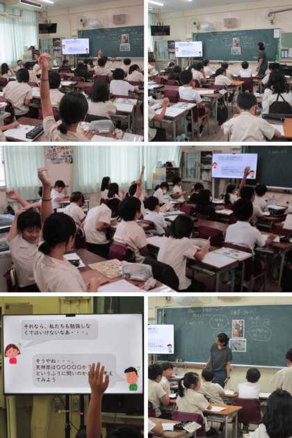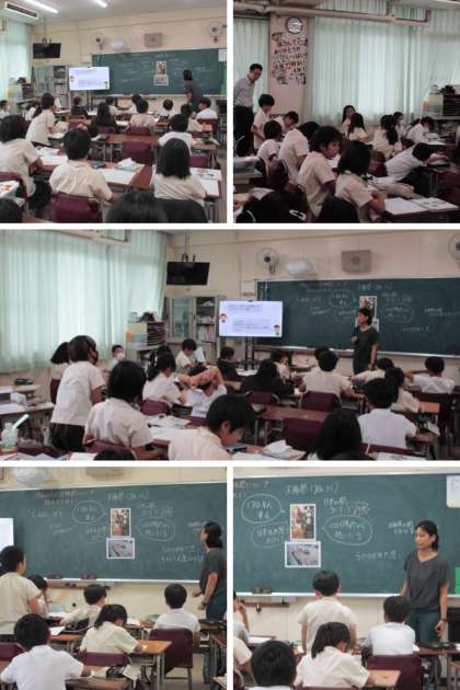 今日は、天神祭りについて、教科書や動画を見ながら、天神祭りを外国の人に伝えるためにどんなことを調べていけばよいのか話し合いました。