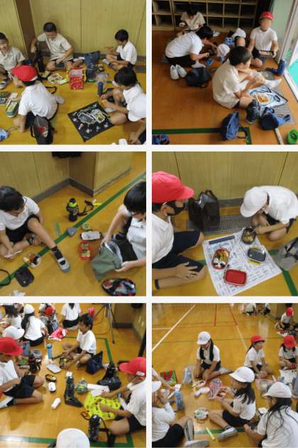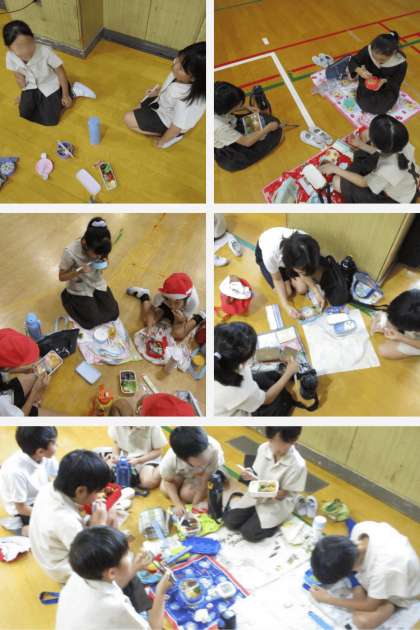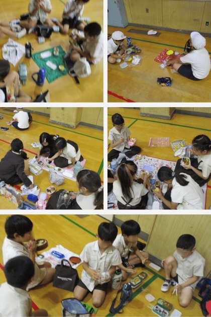 そこで、今日は特別に体育館にシートを敷いて、みんなで楽しくお弁当を食べました。
