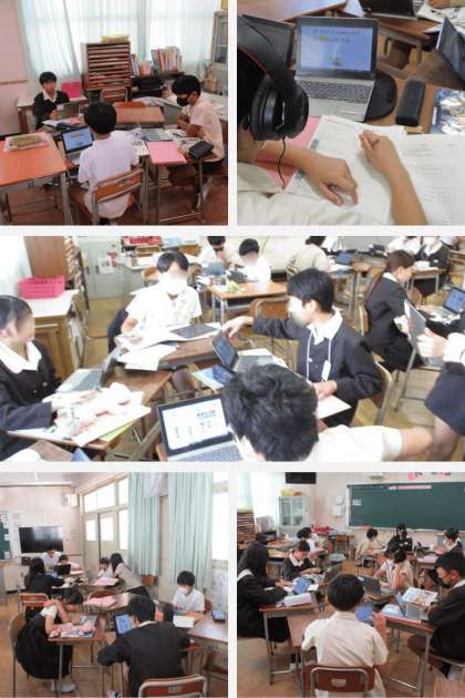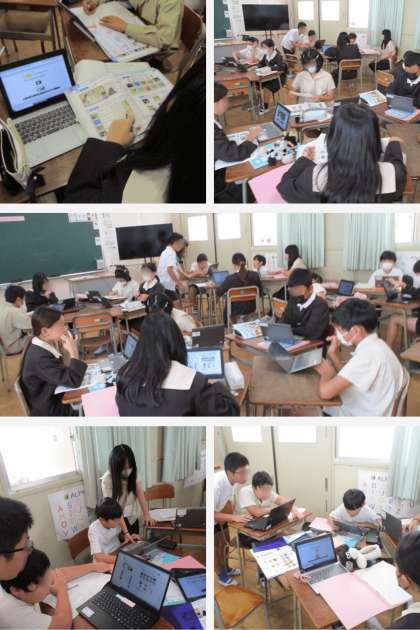外国語科の時間は、「好きな動物の名前の言い方を知る」「動物が食べるものを教える言い方を知る」「動物が食べるものを考えて伝え合う」「好きな動物を演じて"Who am I?"クイズをする」「動物の気持ちを伝えるポスターをかいて伝え合う」などの活動を、自分で計画を立てて、自分のペースで学習しています。