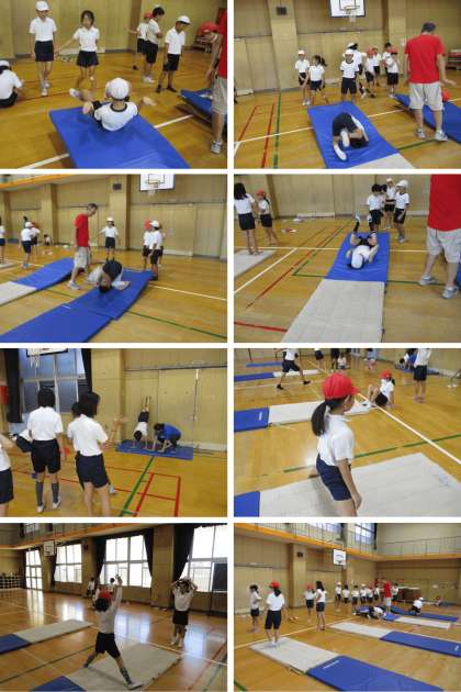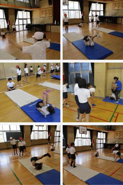 体育科の時間は、マット運動のいろいろな技に挑戦しています。