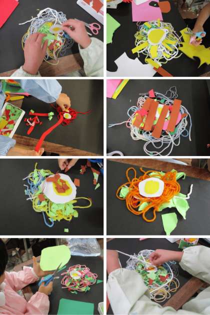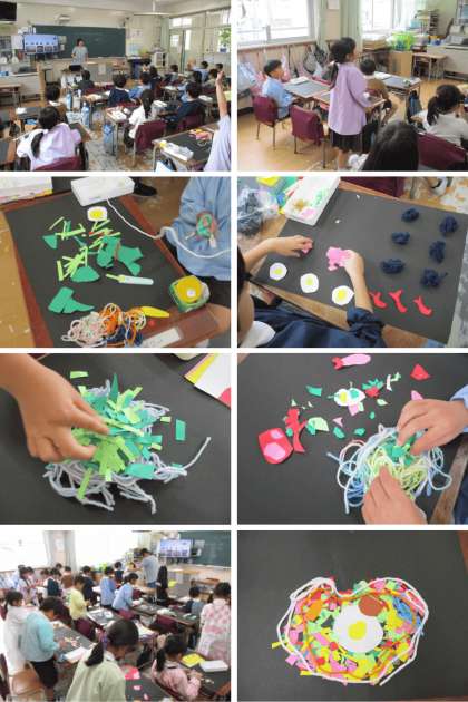 図工科の時間は、画用紙や毛糸などの材料を使って、おいしそうなおこのみやきを作ります。