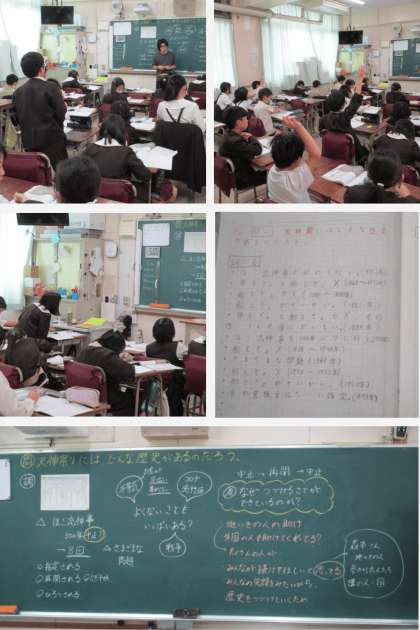社会科の時間は、1000年以上の歴史がある天神祭りは、どのように続けられてきたのか調べ、なぜ1000年以上も続けることができたのかみんなで考えました。