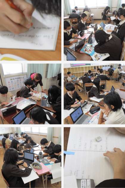 外国語科の時間は、"I live in 〜.""I eat 〜.""I have 〜."などの表現を使って、動物の気持ちを伝えるポスターを作っています。