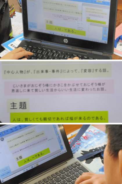 学習用端末を使って、2年生の国語科で学習した「かさこじぞう」がどんな話だったか、また、物語の主題は何か簡潔にまとめる学習をしました。