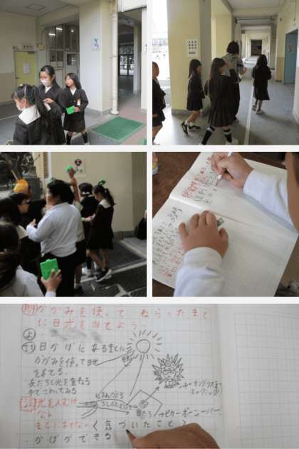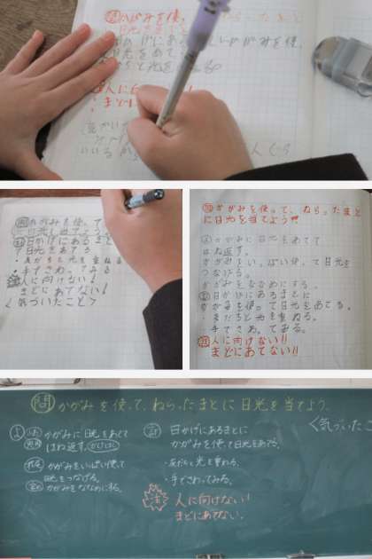 理科の時間は、鏡を使って、ねらったまとに日光を当てる実験をしました。