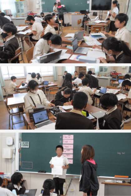 外国語科の時間は、"I live in 〜.""I eat 〜.""I have 〜."などの表現を使って、動物の気持ちを伝えるポスターを作っています。