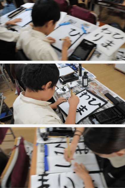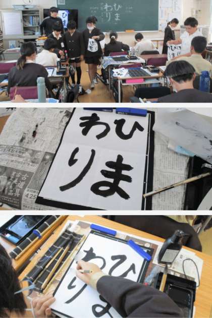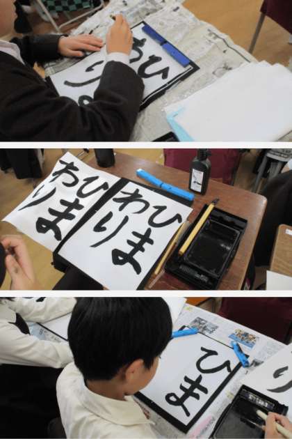 書写の時間は、毛筆で「ひまわり」の字を練習しました。