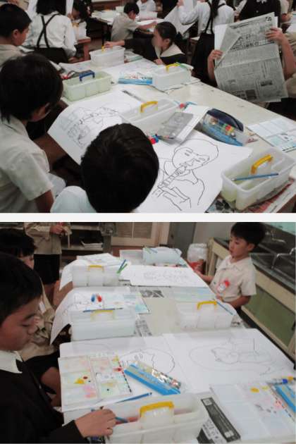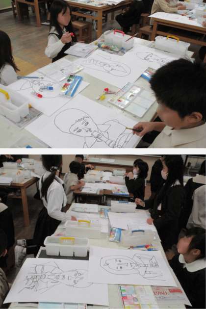 図工科の時間は、リコーダーを吹く自分の姿を題材に絵画の作品を描いています。