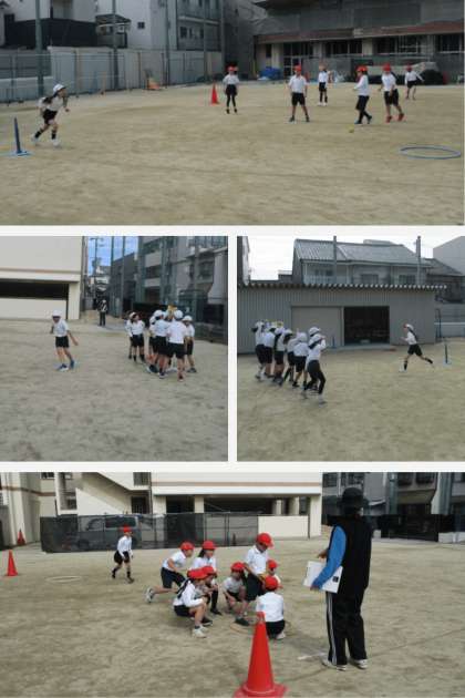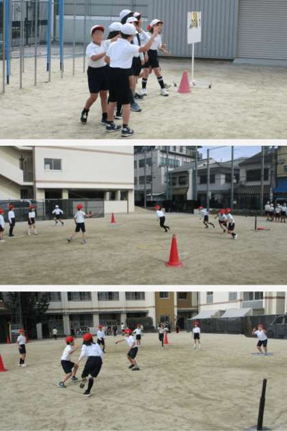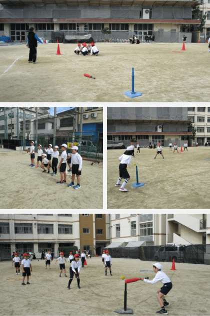 体育科では、「ベースボール型ゲーム」、ティーボールの学習をしました。