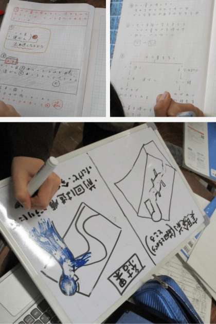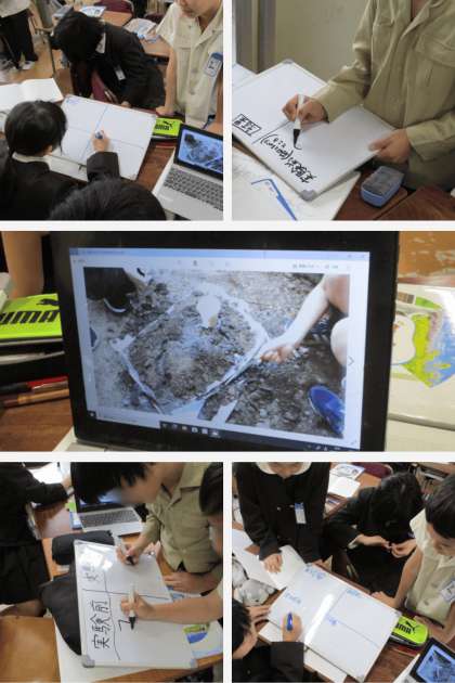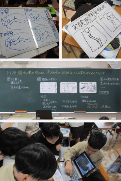 今日は、水の量が増えると、流れる水のはたらきはどんな変化があるのか、実験のようすを撮影した動画で見ながらグループでわかったことをまとめました。